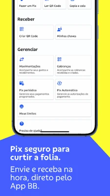App BB-এর মাধ্যমে আপনি তাৎক্ষণিক Pix ব্যবহার করে দ্রুত অর্থ স্থানান্তর করতে পারেন, অথবা IPVA, IPTU এবং অন্যান্য বিল অনায়াসে পরিশোধ করতে পারেন। আপনার কার্ডের সম্পূর্ণ নিয়ন্ত্রণ আপনার হাতে – সীমা নির্ধারণ করুন, ভার্চুয়াল কার্ড ব্যবহার করুন এবং বিশ্বজুড়ে লেনদেন করুন। এটি আপনার আর্থিক পরিকল্পনা এবং বাজেট ব্যবস্থাপনার জন্য প্রয়োজনীয় সমস্ত সরঞ্জাম সরবরাহ করে, কোফ্রিনহো বিবি-এর মতো স্মার্ট টুলসের সাহায্যে সঞ্চয় লক্ষ্য নির্ধারণে সহায়তা করে।
